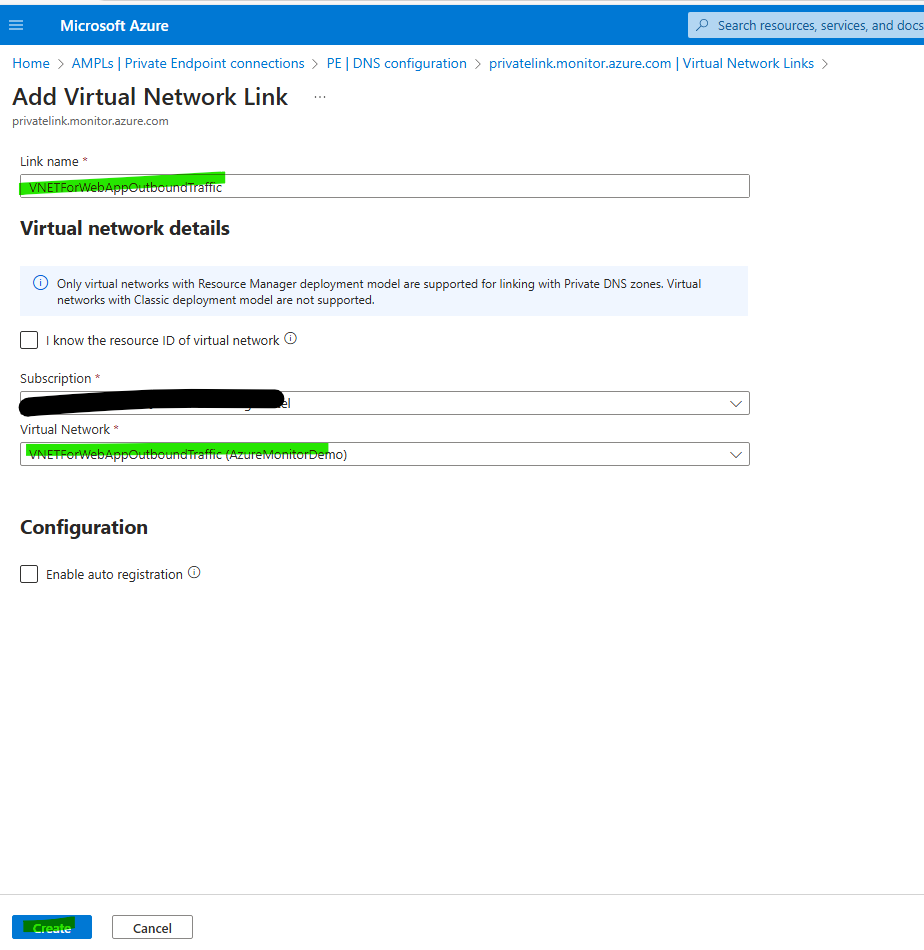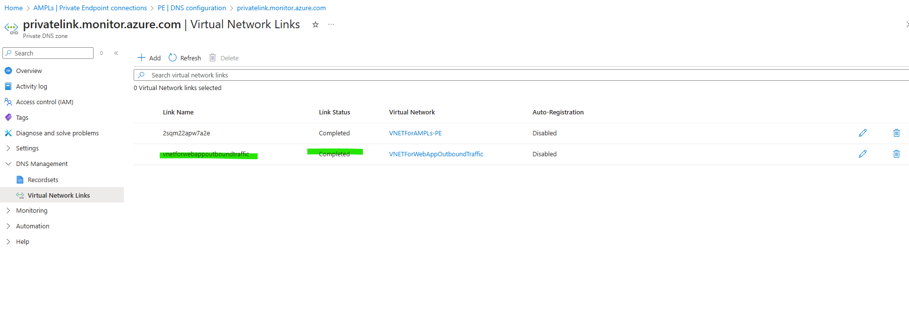 Add Virtual Network Link in AMPLs -> PE -> Private DNS Zone for the Web App Outbound traffic VNET.