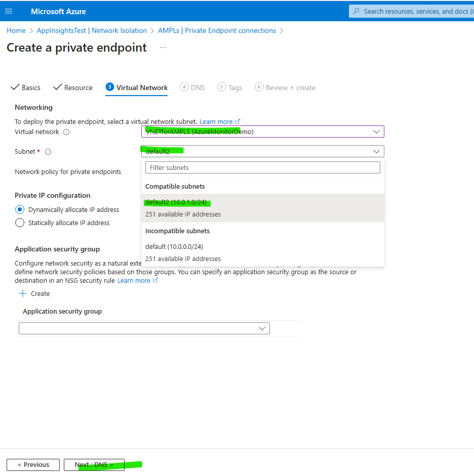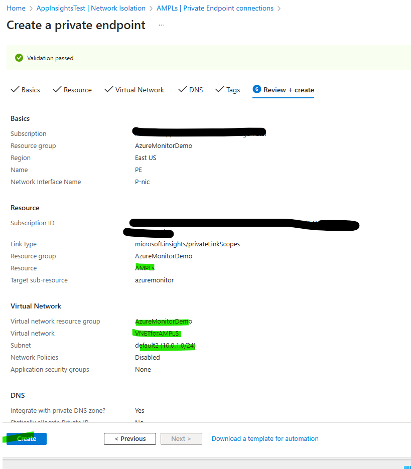 Configure AMPLs and PE: Add the monitored Application Insights component in AMPLs.